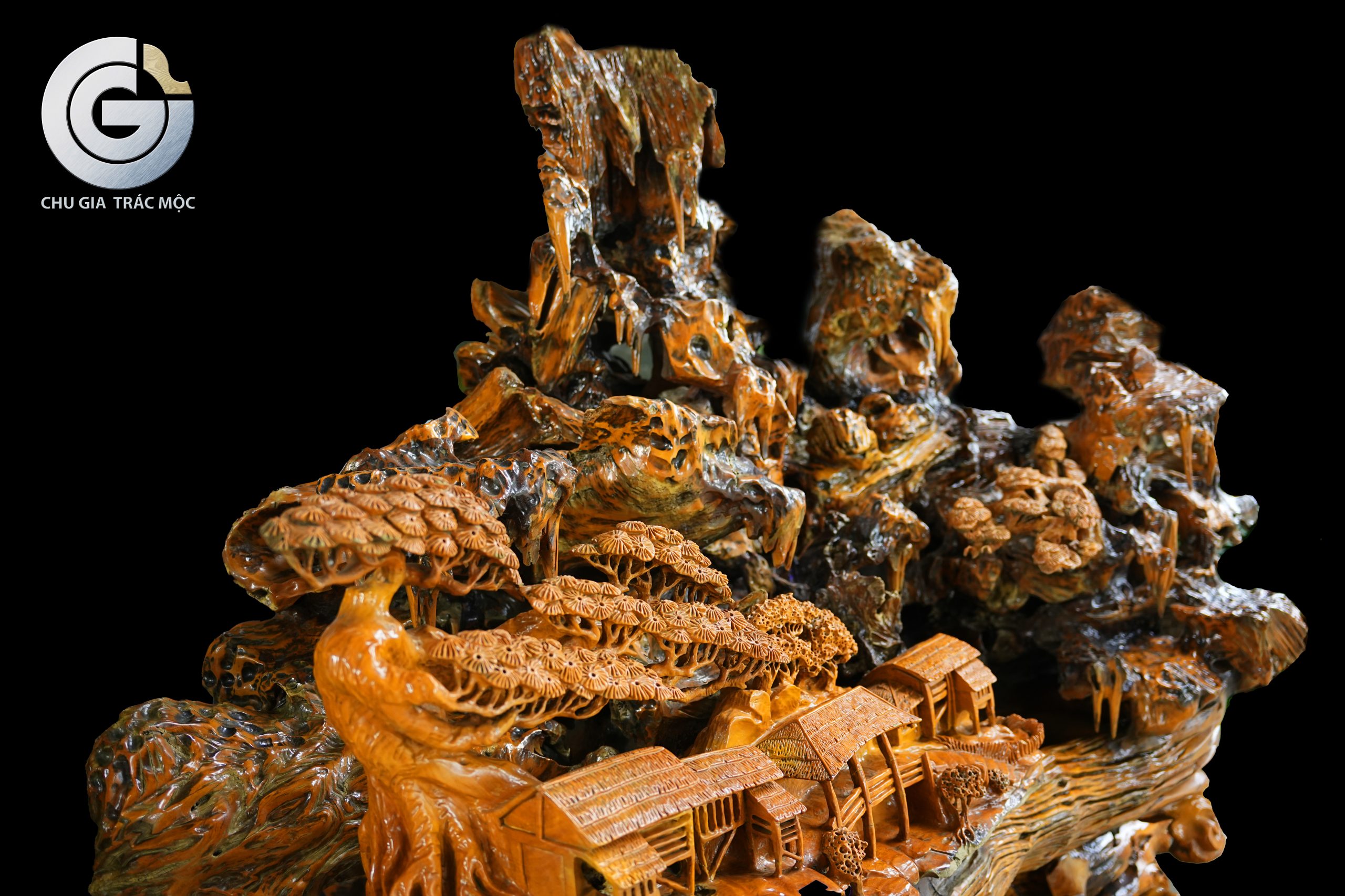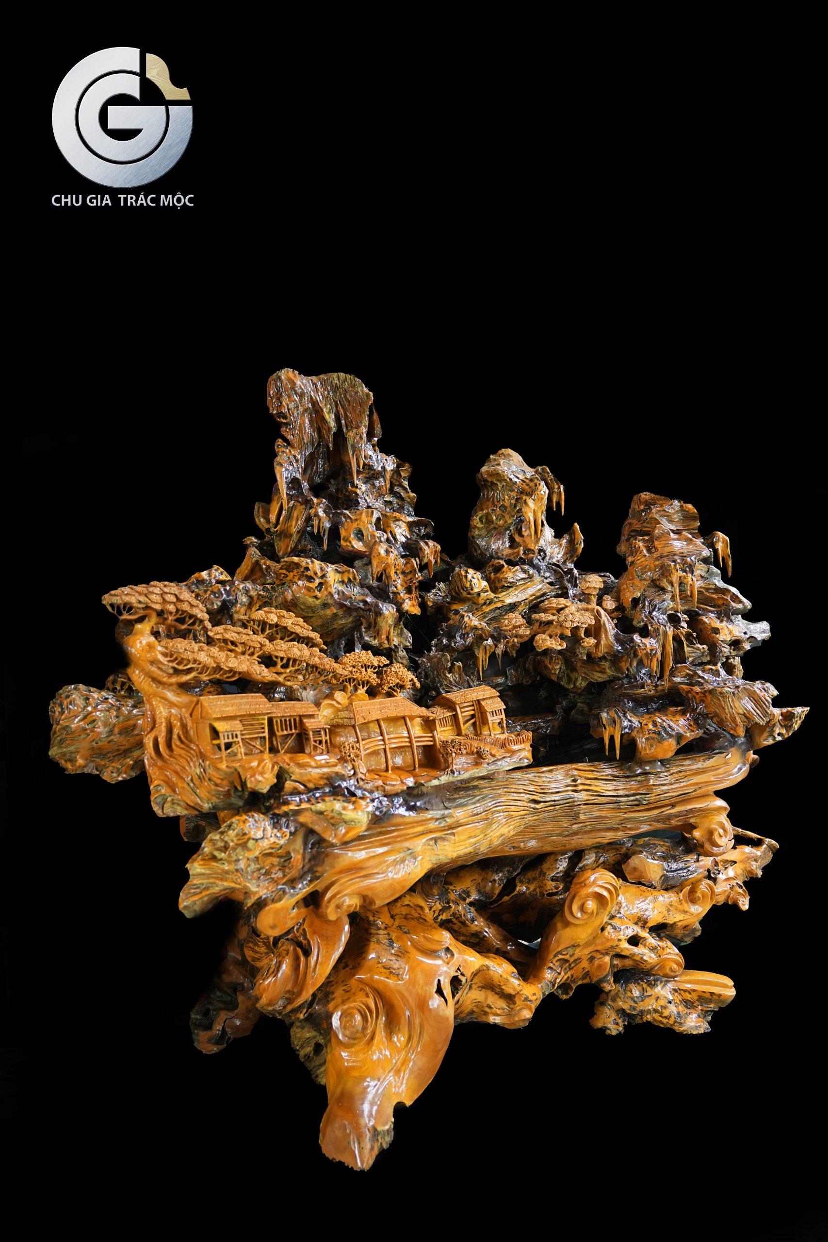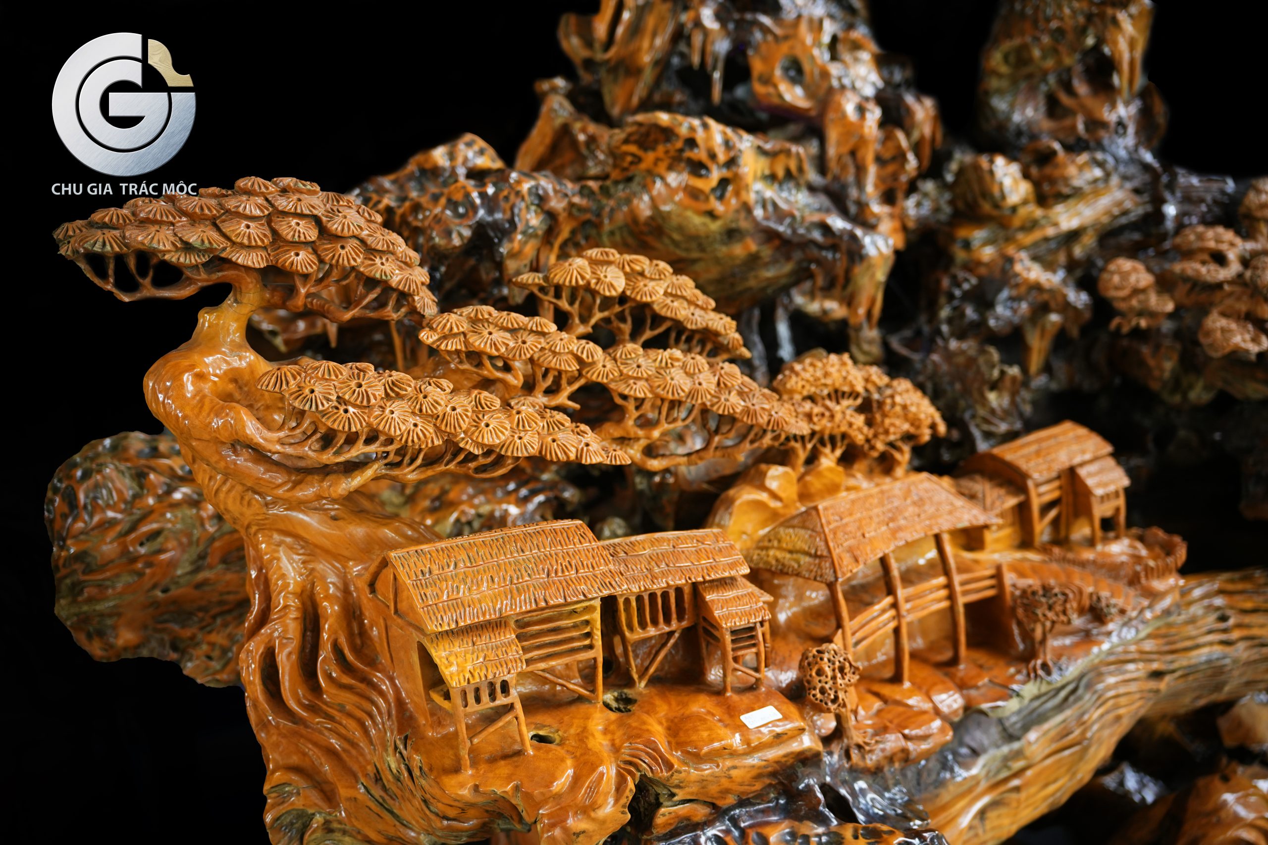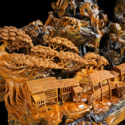 Trên nền gỗ lũa Trai Vàng, làng mạc được điêu khắc gọn gàng và tinh tế trên một mặt phẳng của khối lũa. Các nếp nhà quần tụ, sắp xếp mạch lạc, tạo cảm giác gần gũi và ấm áp. Hình ảnh ấy gợi lên tinh thần sum họp, an cư và sự gắn bó giữa con người trong cùng một không gian sống.