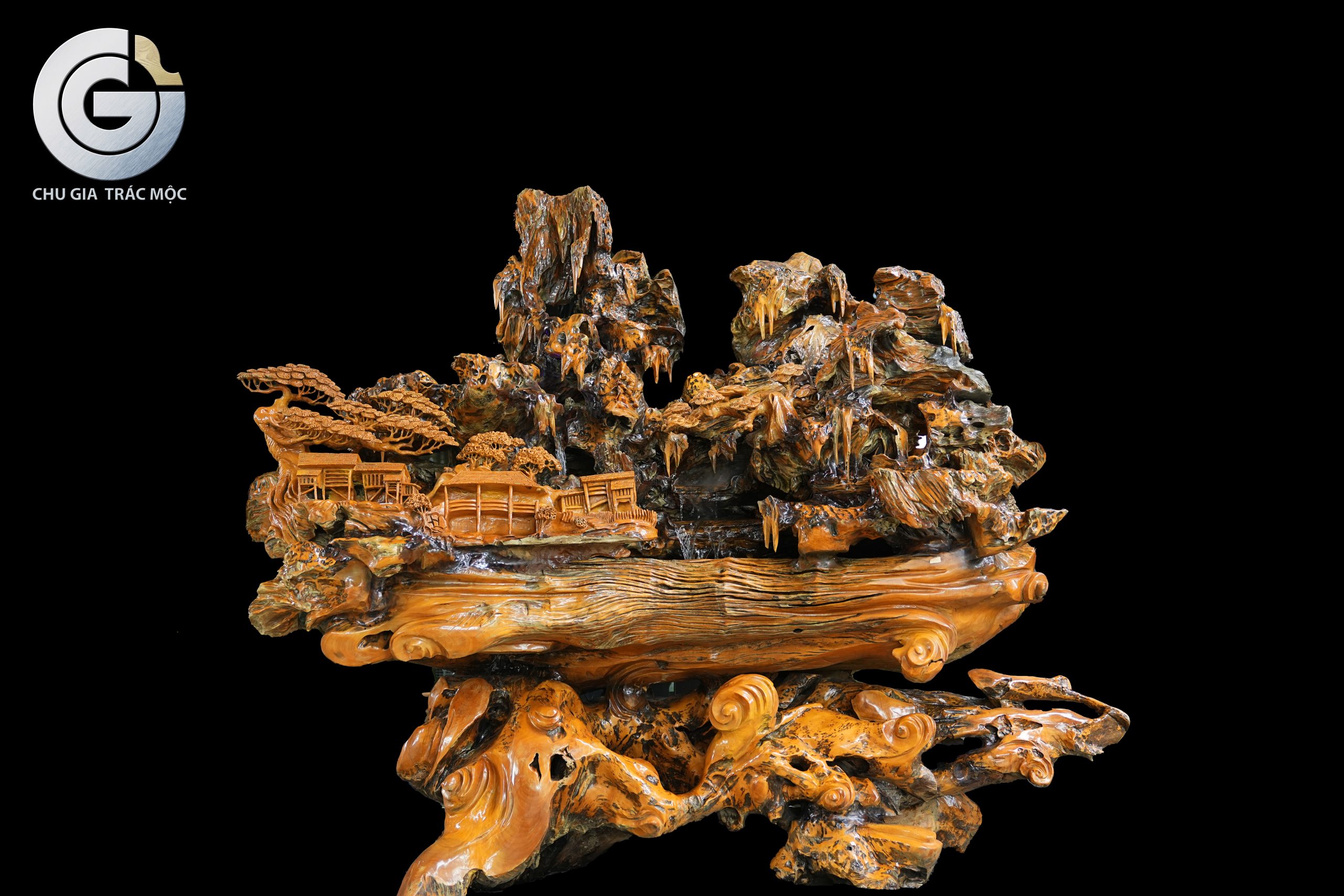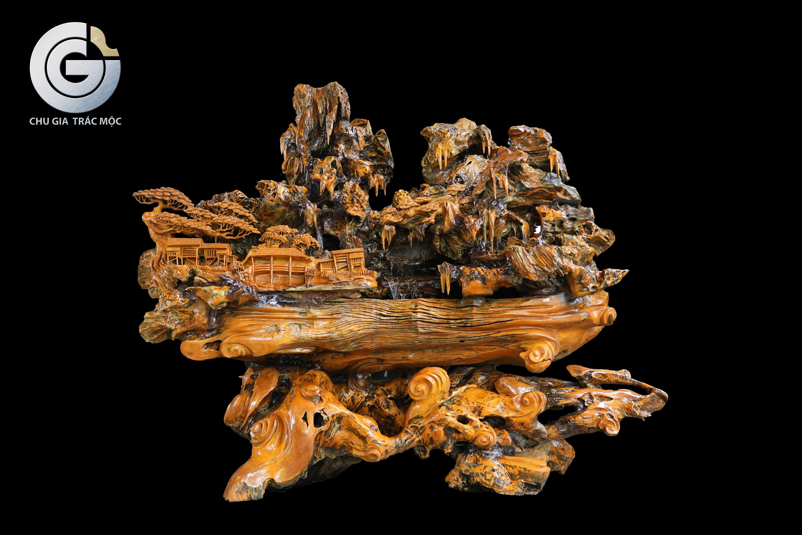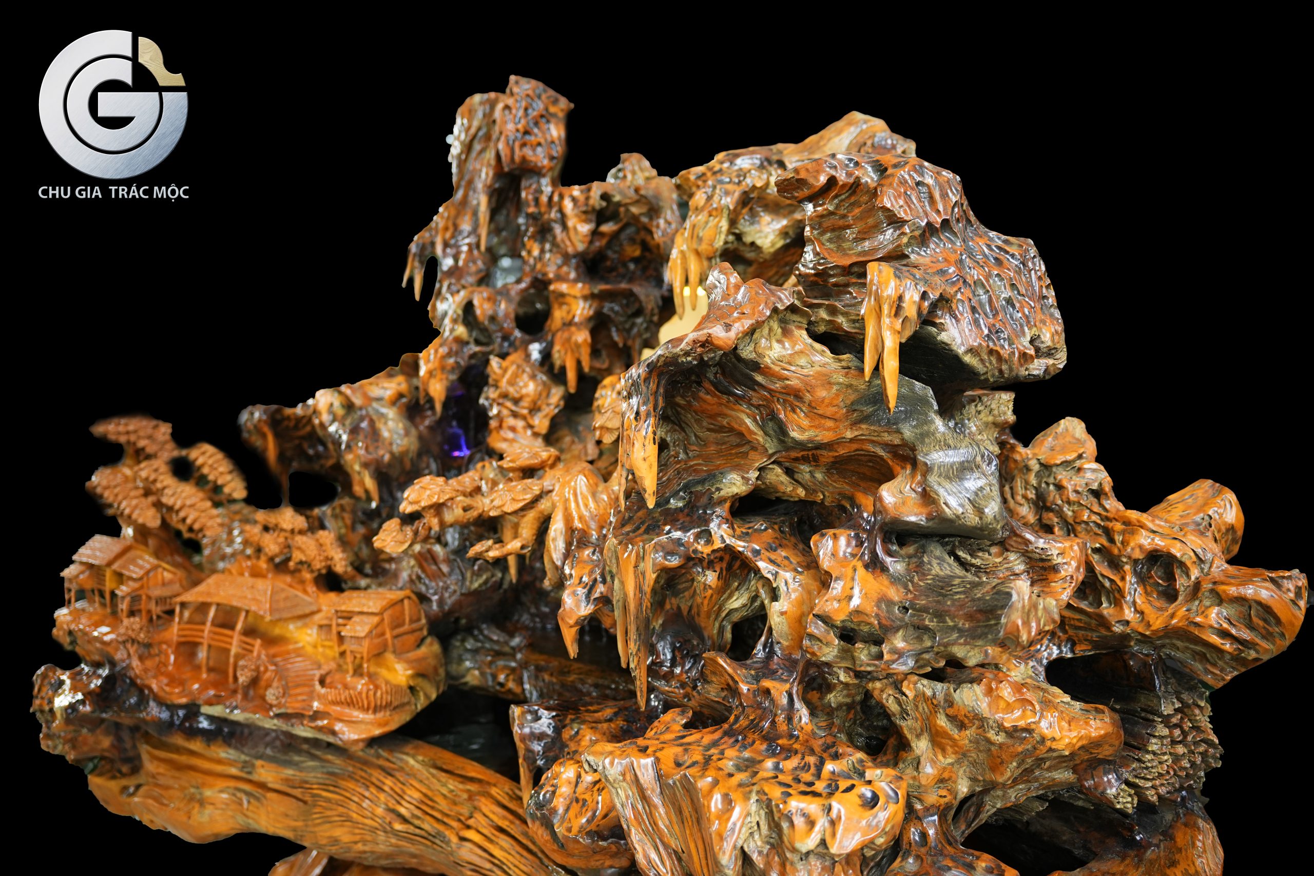 Trên nền gỗ lũa Trai Vàng, làng mạc được điêu khắc gọn gàng và tinh tế trên một mặt phẳng của khối lũa. Các nếp nhà quần tụ, sắp xếp mạch lạc, tạo cảm giác gần gũi và ấm áp. Hình ảnh ấy gợi lên tinh thần sum họp, an cư và sự gắn bó giữa con người trong cùng một không gian sống.