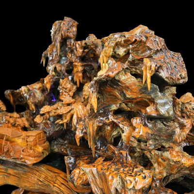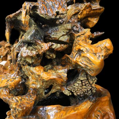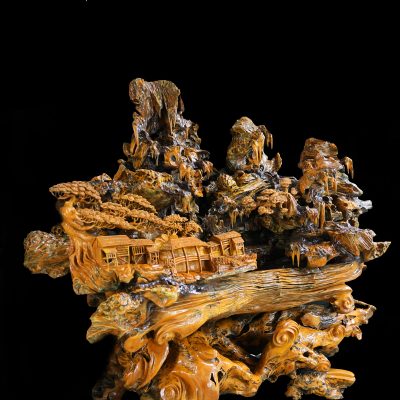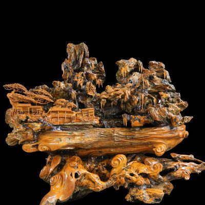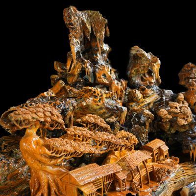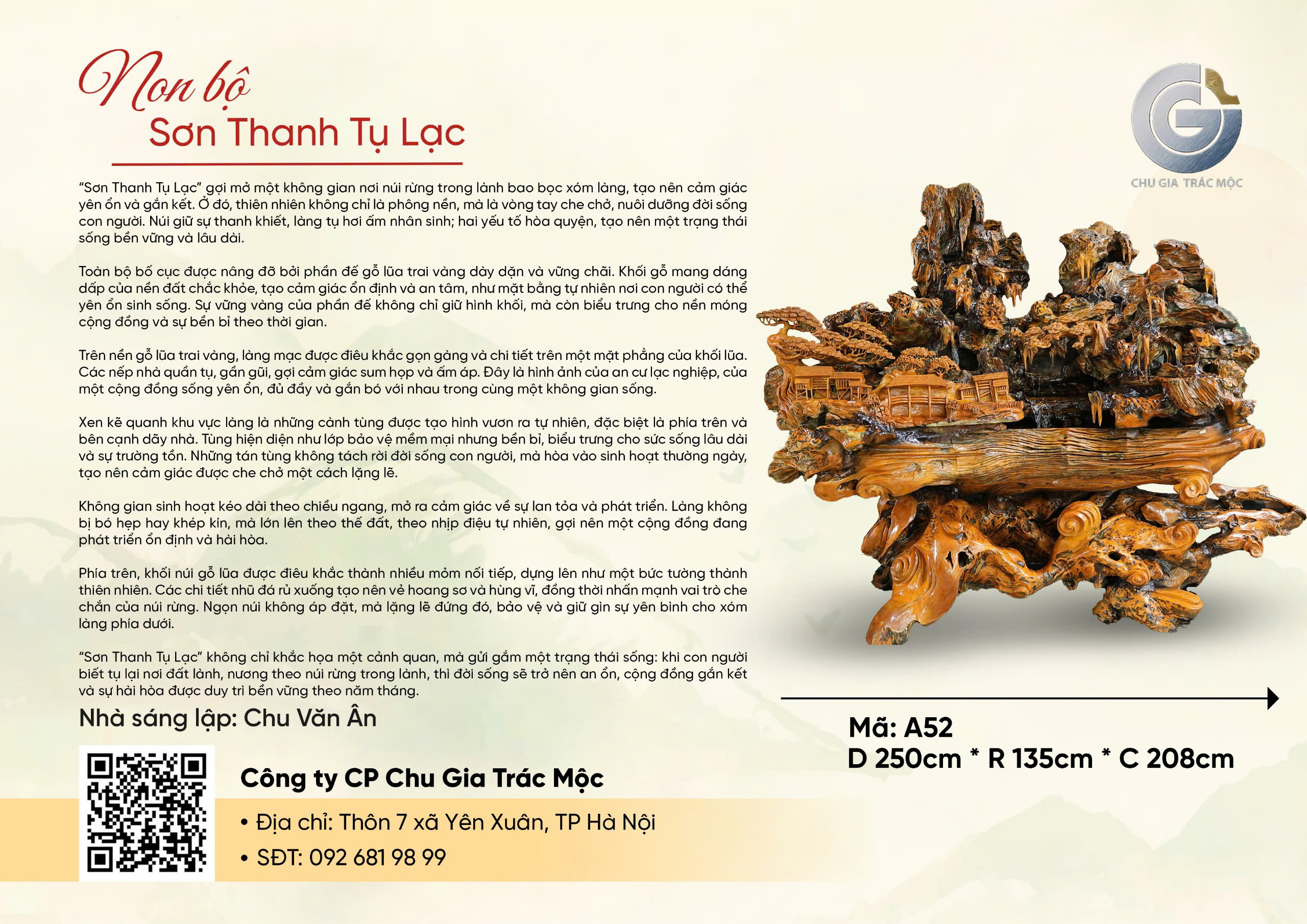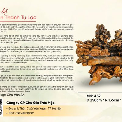 “Sơn Thanh Tụ Lạc” là một tác phẩm điêu khắc gỗ lũa mang hình ảnh núi rừng trong lành bao bọc xóm làng, gợi mở một không gian sống yên ổn, hài hòa và gắn kết. Tác phẩm không hướng đến sự hùng vĩ phô trương, mà dẫn dắt người thưởng lãm bước vào một cảnh giới trầm lắng – nơi con người và thiên nhiên cùng hiện diện trong thế cân bằng bền vững.