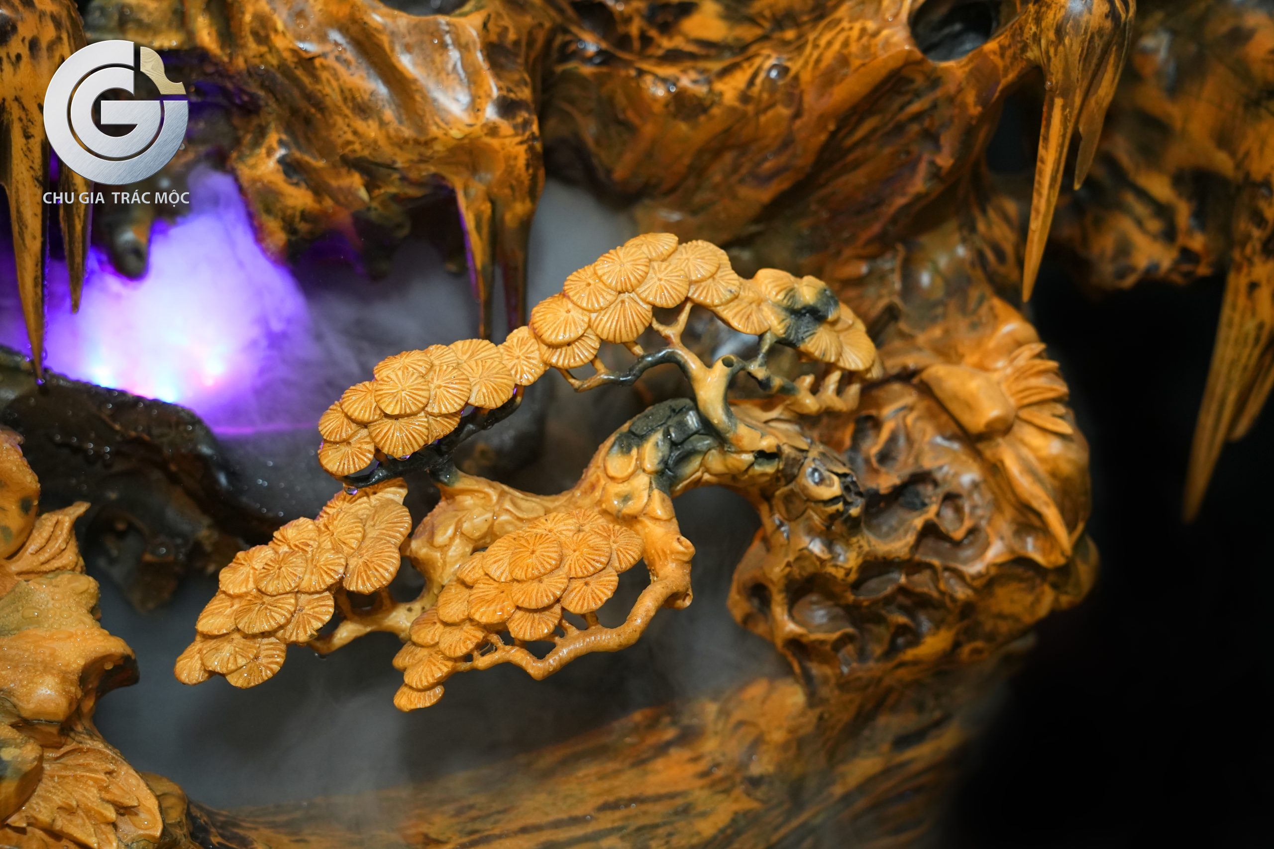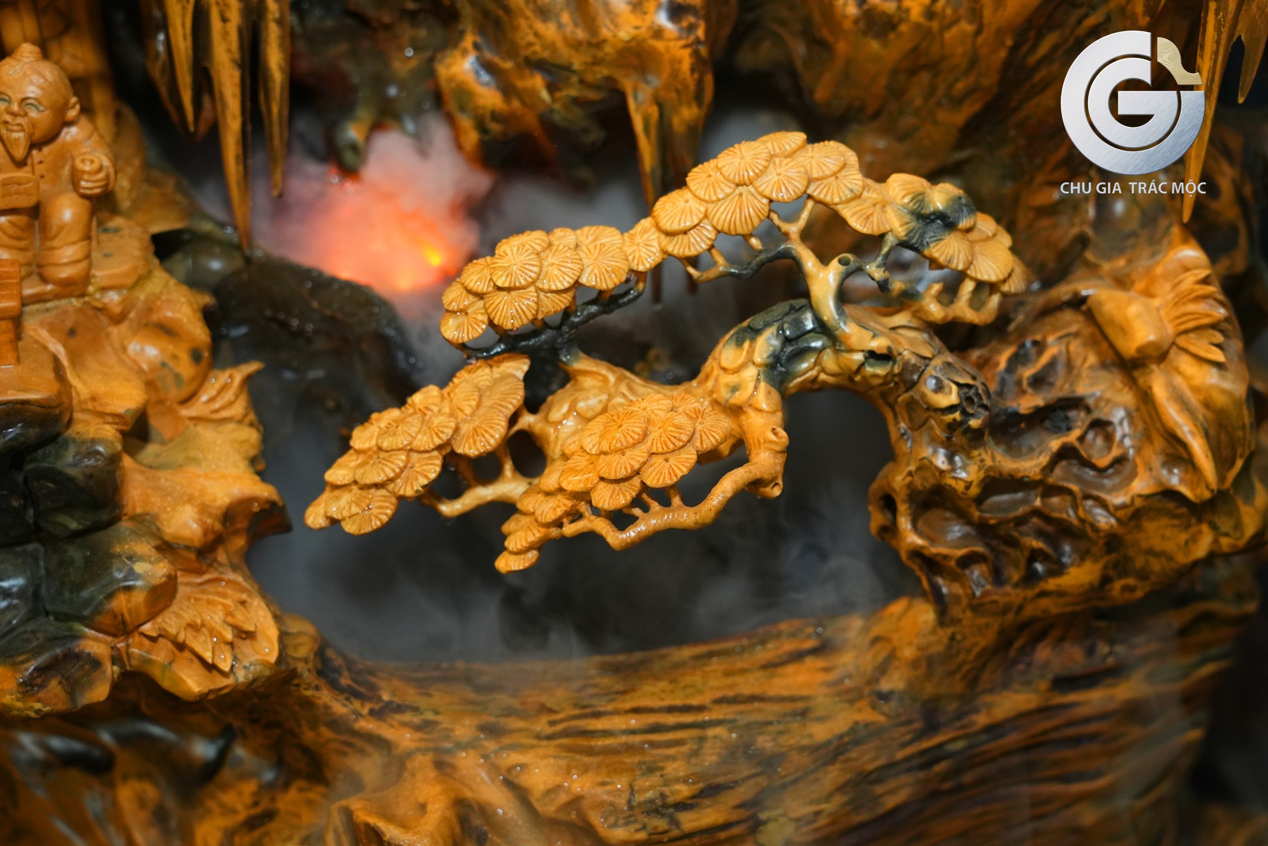 Ở trung tâm bố cục, cây Tùng vươn lên giữa núi gỗ lũa, tán rộng như ôm trọn toàn bộ khung cảnh. Tùng là biểu tượng muôn đời của khí tiết, sự kiên cường và trường thọ. Trong tác phẩm, cây tùng không chỉ là yếu tố tạo hình, mà còn là lời chúc sống lâu – sống bền – sống vững vàng trước mọi đổi thay của đời người.