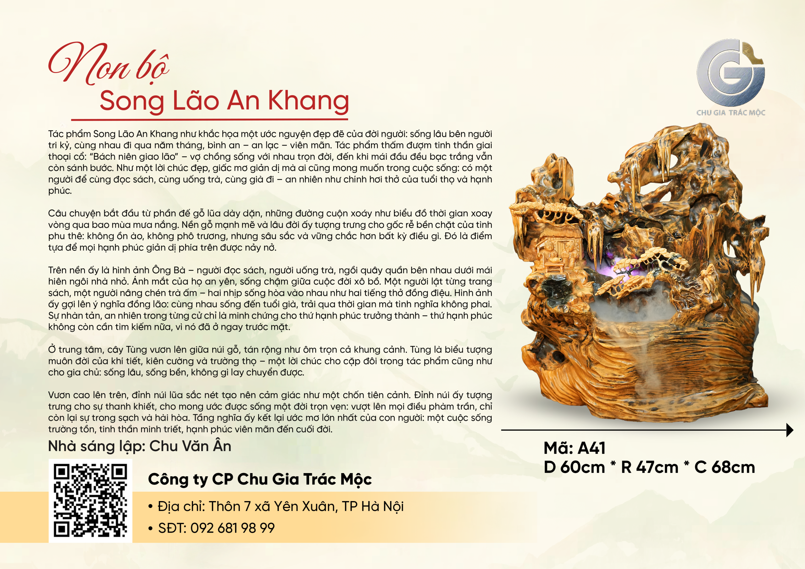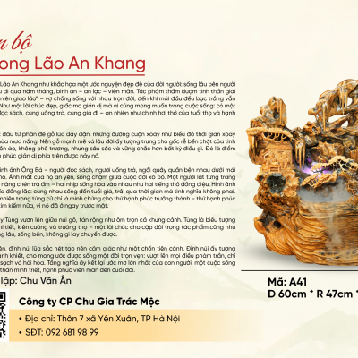 “Song Lão An Khang” là một tác phẩm độc bản, được xây dựng trên sự tiết chế tinh tế trong chi tiết và bố cục. Nghệ nhân không tìm cách phô diễn kỹ thuật, mà để cho hình khối tự nhiên của gỗ lũa dẫn dắt cảm xúc, tạo nên một tổng thể nhẹ nhàng nhưng thấm sâu.