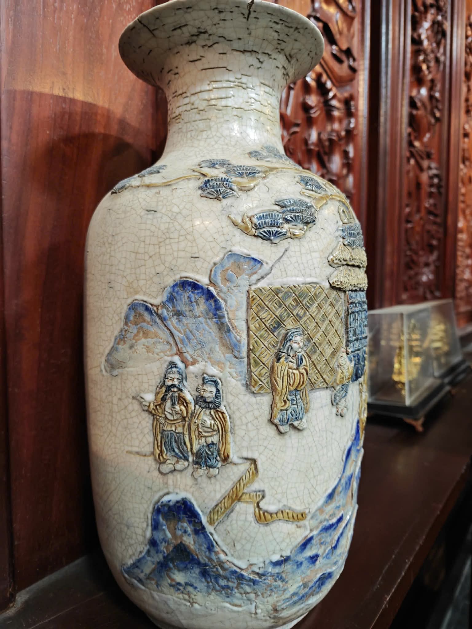 Cặp bình gốm men rạn đắp nổi sơn thủy – văn nhân