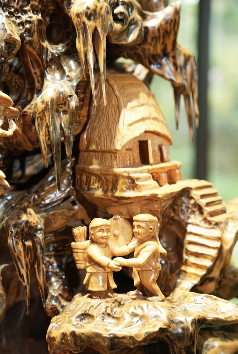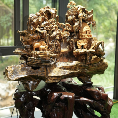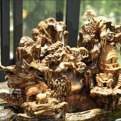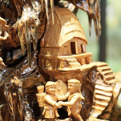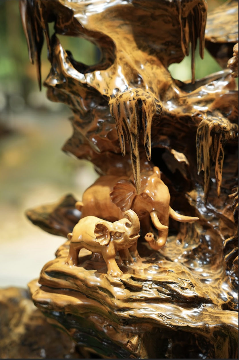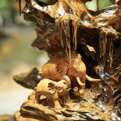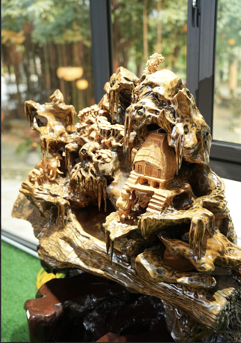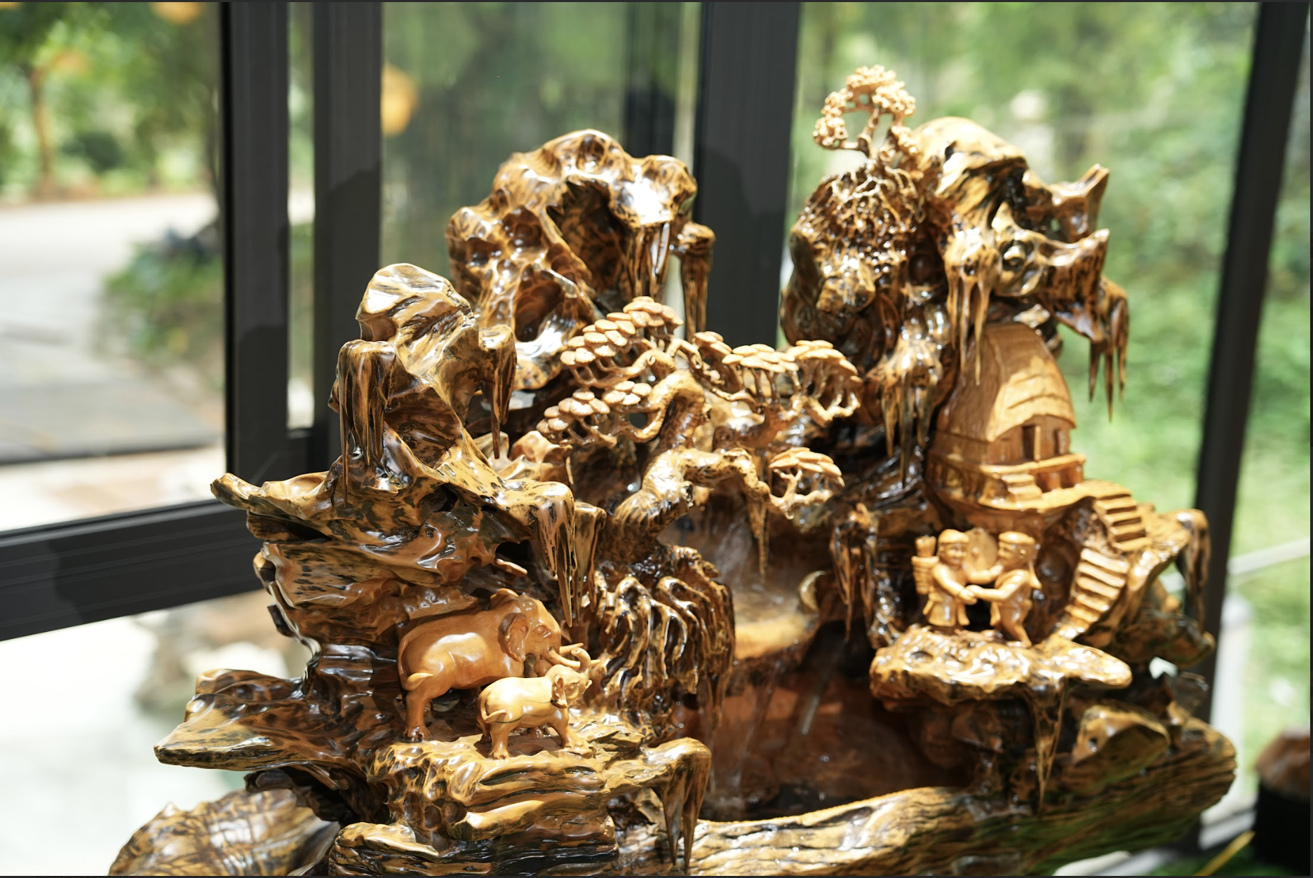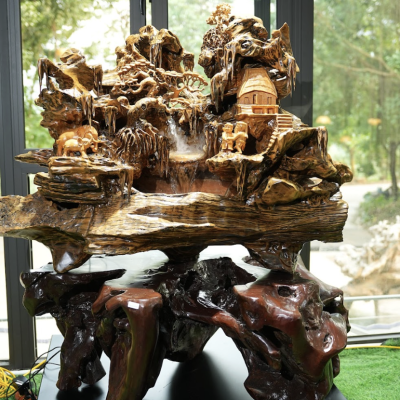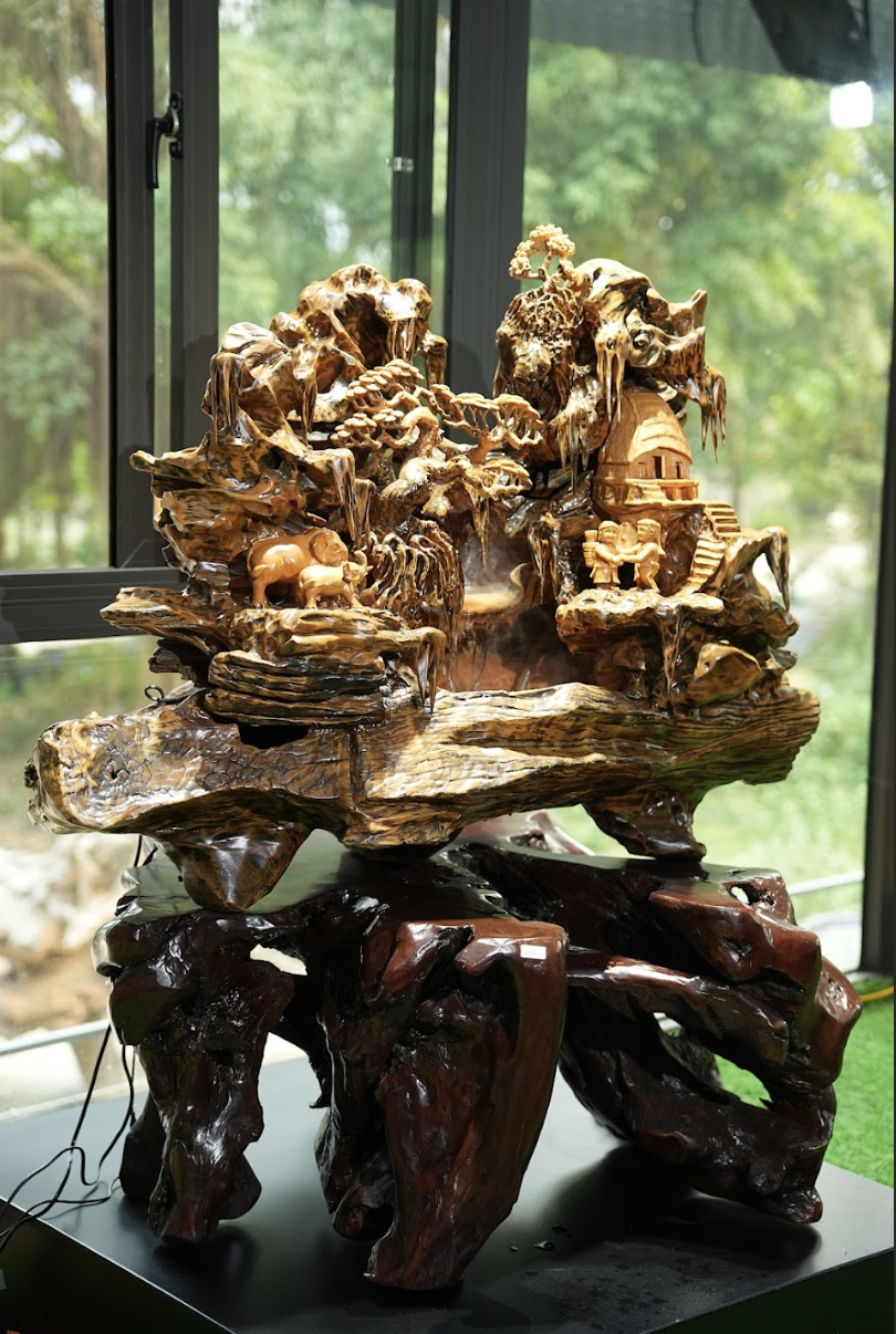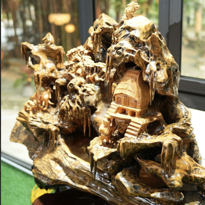 “Thanh Âm Đại Ngàn” là một tác phẩm non bộ gỗ lũa tái hiện không gian núi rừng nguyên sơ – nơi thiên nhiên, con người và muông thú cùng tồn tại trong một trạng thái hài hòa, không phân tách. Tác phẩm không hướng đến việc mô tả chi tiết, mà gợi nên một “âm thanh” vô hình: nhịp sống của đại ngàn, trầm sâu và bền bỉ theo thời gian.